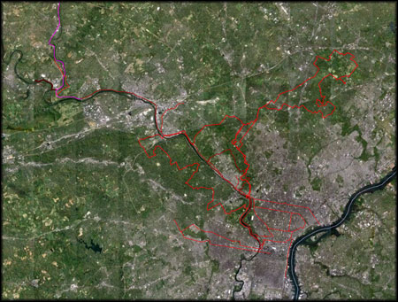 Bicycling is my main form of transportion, and I've turned-over thousands of miles on my bikes. All that riding means I've done some interesting rides. Below are my favorite rides in the Washington, DC region, the Philadelphia region, and some miscellaneous rides. Clicking the image below will download the kmz files for viewing in Google Earth.