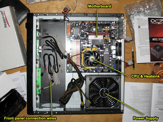 In the above image, I've already removed the aluminum tray that will hold the hard drive and optical drive, installed the motherboard, processor, processor heatsink, and power supply.
